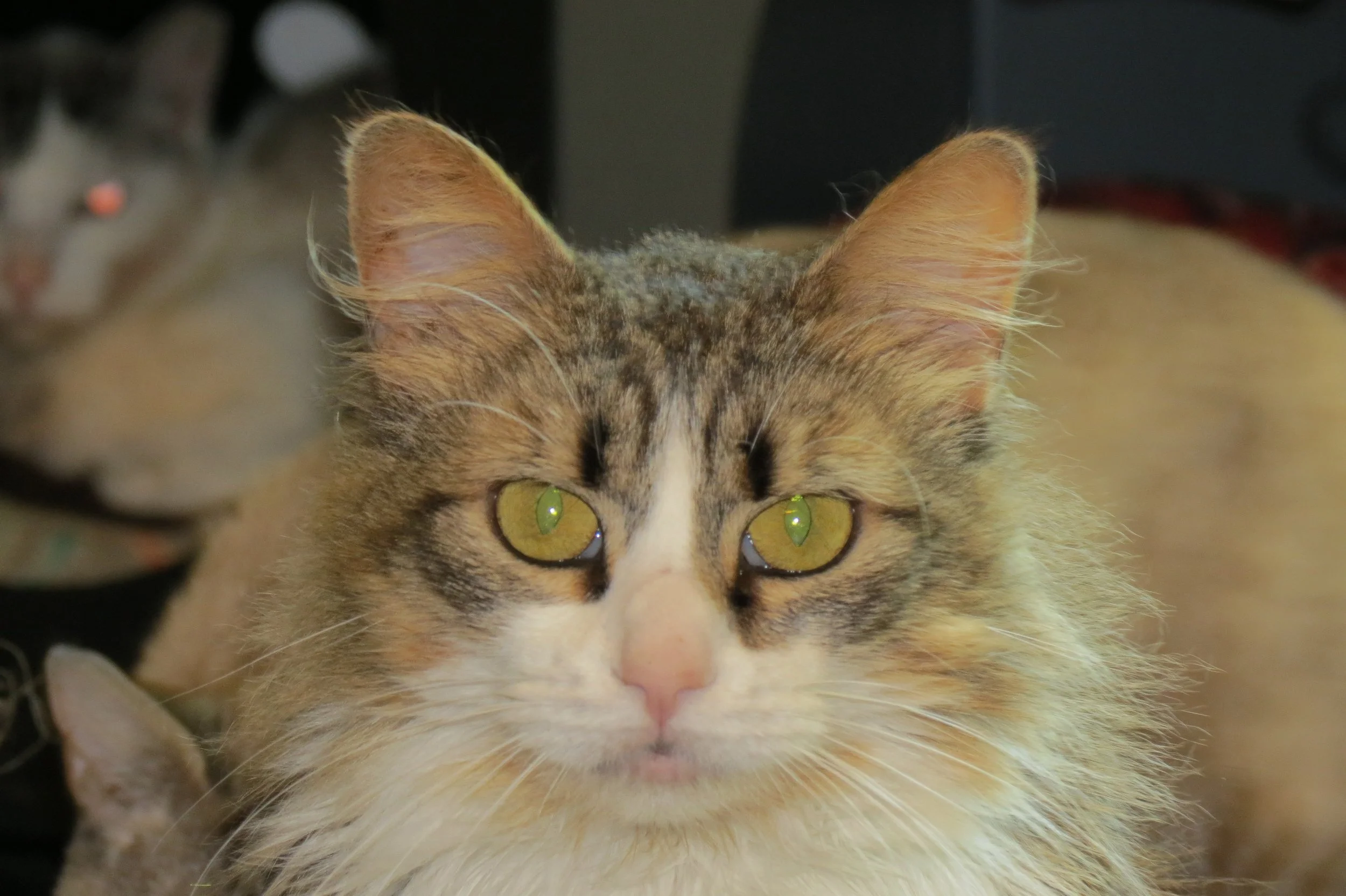 Lady was in bad shape before she came to the Commune as a one year old kitten - unspayed, covered in fleas, and suffering from uncontrolled seizures. Surrendered by her owner, Lady immediately received medical care including flea treatment, a spay surgery, and a medication regimen to control her seizures. With medication Lady continued to have occaisional seizures. but nothing compared to the near constant seizures she experienced in her first year of life.